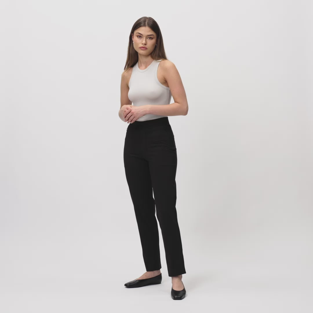 Explore the perfect blend of tailored style and loungewear comfort with our Asana Slim Pant. Watch the video to see how the peach-soft fabric, discrete zip pockets, and high centrefold waist make these ankle-length trousers ideal for any occasion.