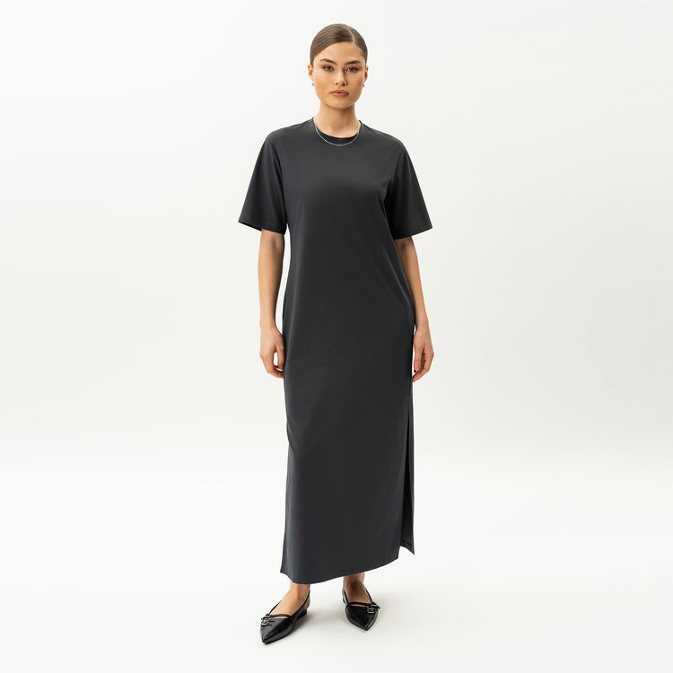 This is the dress you’ll reach for again and again. Made from a soft, breathable cotton blend, it has a relaxed fit with subtle shaping and side slits for easy movement. Designed to dress up or down, it’s a versatile staple made for comfort and ease.