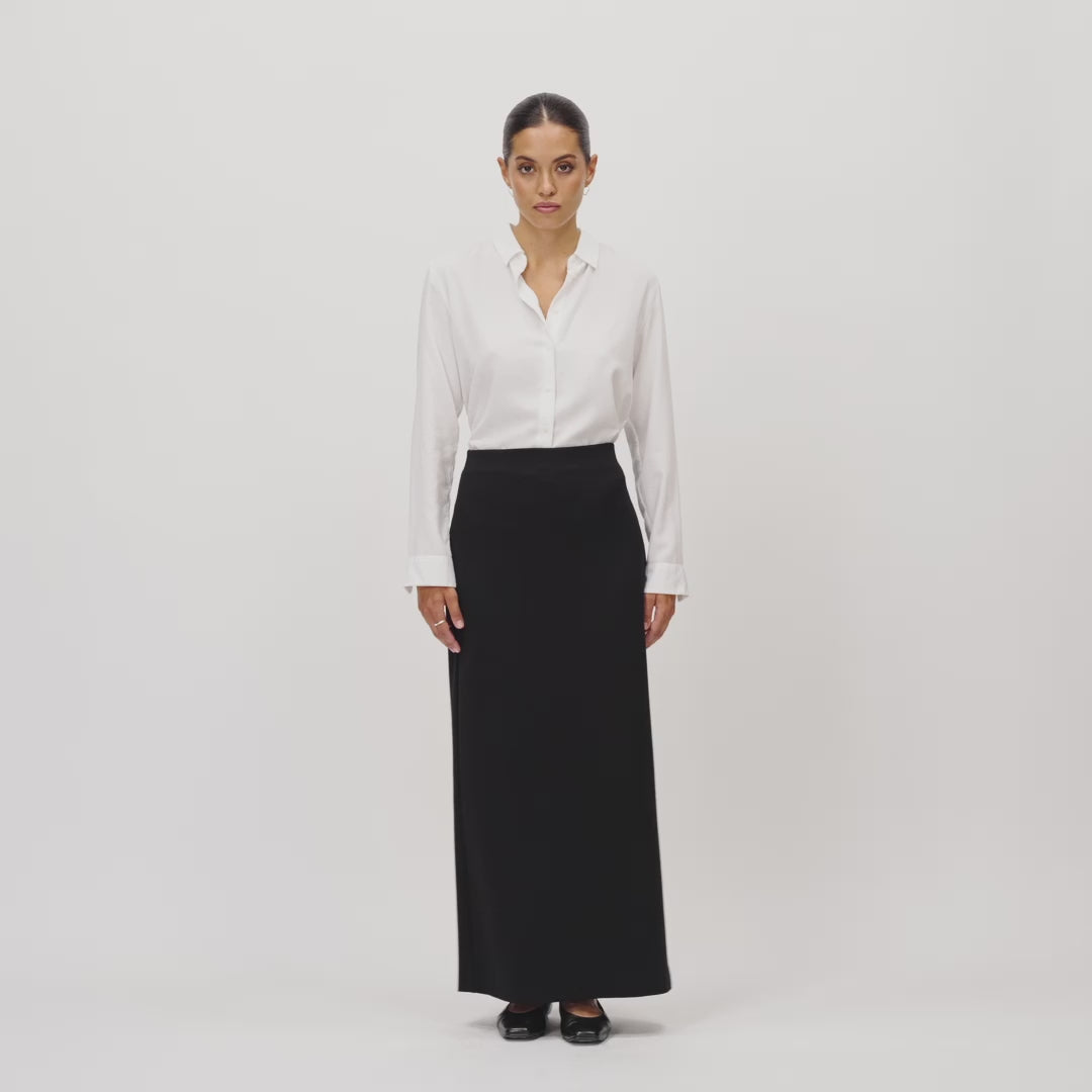 Our maxi skirt blends sophistication and comfort, crafted from luxurious double-knit ponte fabric with a high waist, hidden elastic waistband, dart details, and a back slit for ease of movement.​